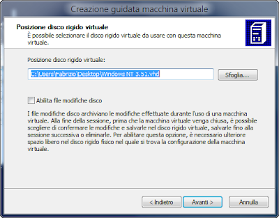 Cliccate su Sfoglia e scegliete il file VHD scaricato (l’hard disk), premete Avanti e terminate con Fine.