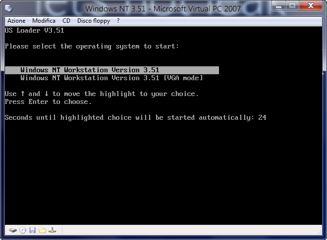 Scaricate Microsoft Virtual PC 2007 e il VHD (l’hard disk di Windows NT 3.51) e installate il programma.