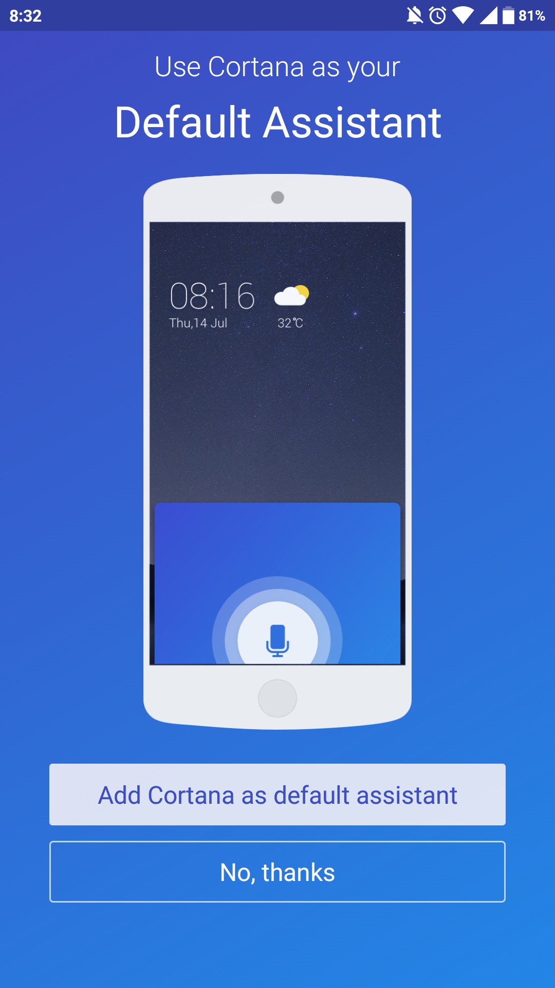 • Introdotta una nuova schermata all’avvio dell’app che consiglia di impostare Cortana come assistente predefinito.