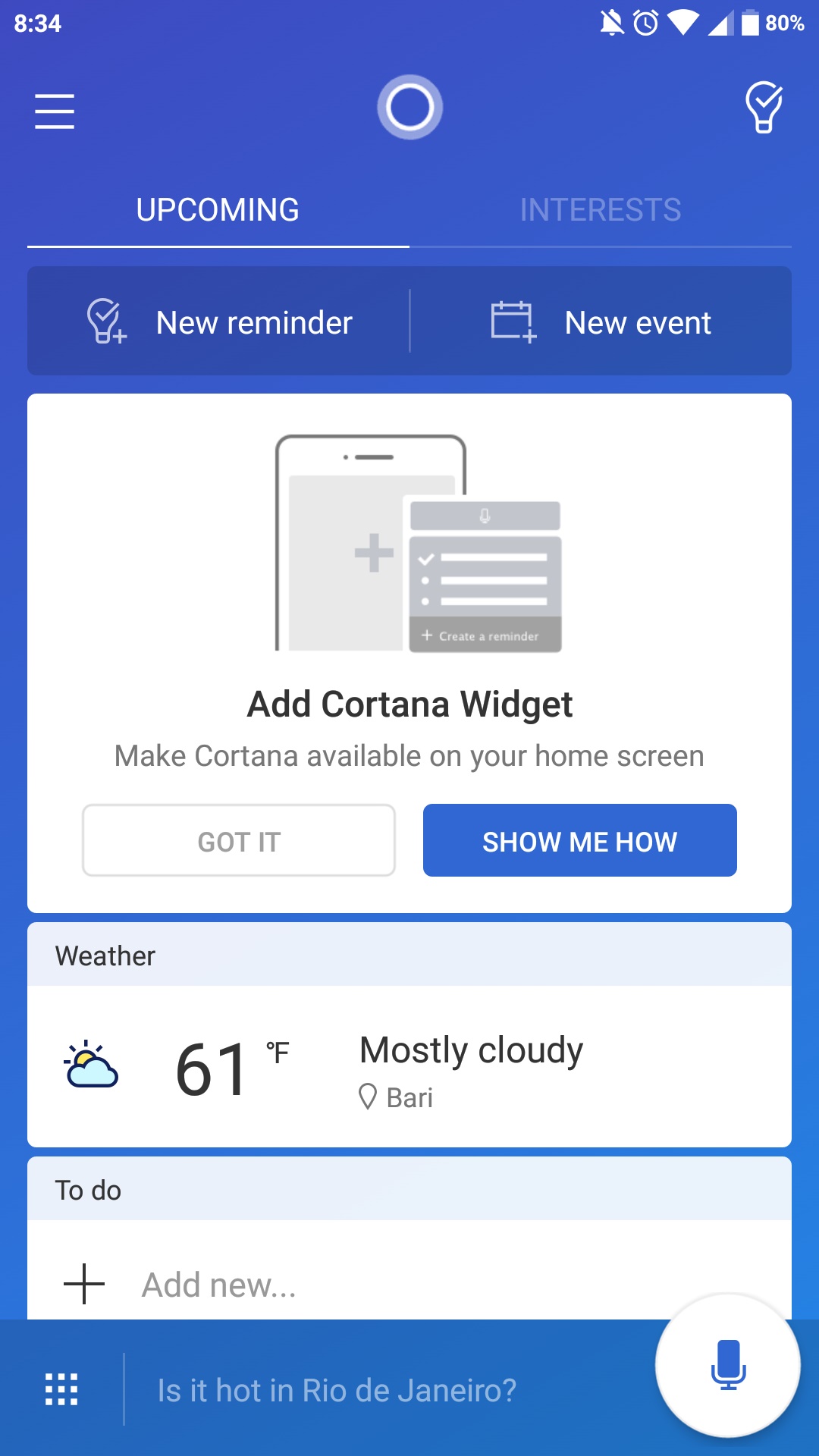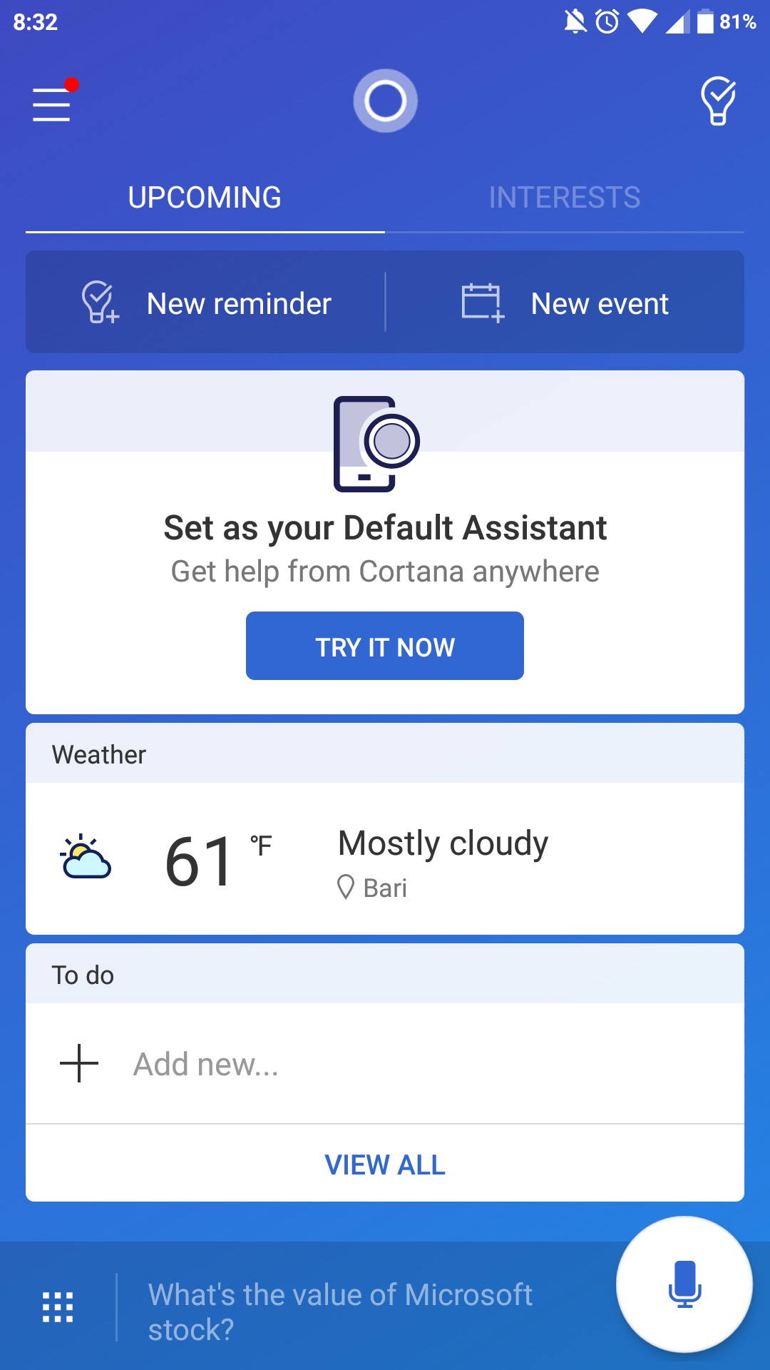 - Introdotta una nuova schermata all’avvio dell’app che consiglia di impostare Cortana come assistente predefinito.