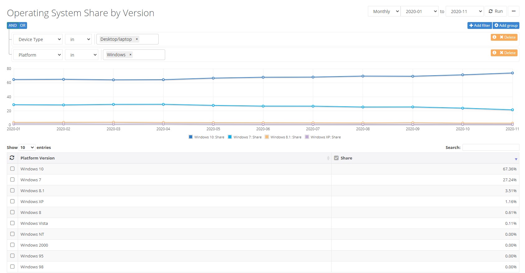 Windows 7, rilasciato nell’ormai lontano 2009, non accenna a morire, nonostante sia passato un anno dalla fine del supporto esteso di Microsoft. Il 14 gennaio 2020, infatti, Microsoft ha staccato la spina agli aggiornamenti ufficiali di Windows 7, chiedendo agli utenti di passare a un sistema operativo più recente e più aggiornato, come Windows 10. A inizio 2021, tuttavia, sembrano essere almeno 100 milioni gli utenti che usano un sistema operativo non più supportato. StatCounter afferma che Windows 7 aveva una percentuale di mercato del 17,6 a novembre 2020 – con Windows 10 al 75 %; NetMarketShare, invece, assegna il 21 % del mercato all’ormai vetusto sistema operativo, registrato a ottobre 2020, con Windows 10 al 74 %.