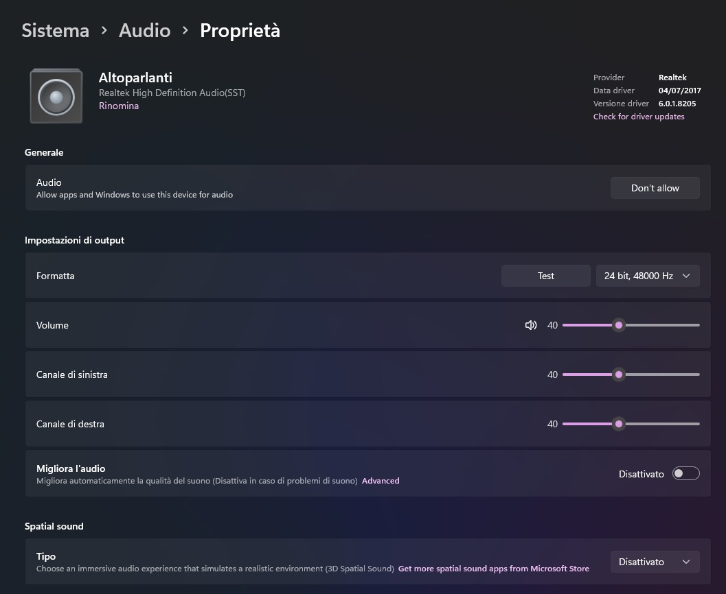 - Quando si gestiscono i dispositivi audio, la pagina delle proprietà ora mostra il provider, la data e la versione del driver e varie opzioni relative all’uscita audio come il formato, il volume, il canale sinistro e destro, il miglioramento dell’audio e il tipo di audio (stereo, mono).