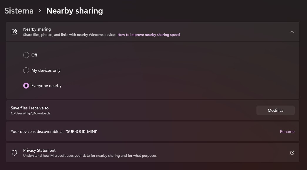 - Include le impostazioni relative alla condivisione nelle vicinanze di “Esperienze condivise”.