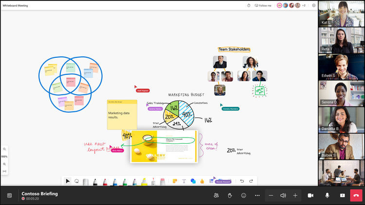 - Miglioramenti della lavagna in Teams Rooms su Android – Puoi usare la lavagna in una riunione o quando collabori offline con i colleghi. Quando usi la lavagna al di fuori delle riunioni, il tuo contenuto viene mantenuto anche quando inizia una riunione. Il contenuto della lavagna viene conservato e condiviso con i partecipanti remoti all’istante. Puoi anche usare la funzione “Seguimi” per guidare i partecipanti mentre navighi e i cursori collaborativi ti consentono di vedere tutti al lavoro in tempo reale.