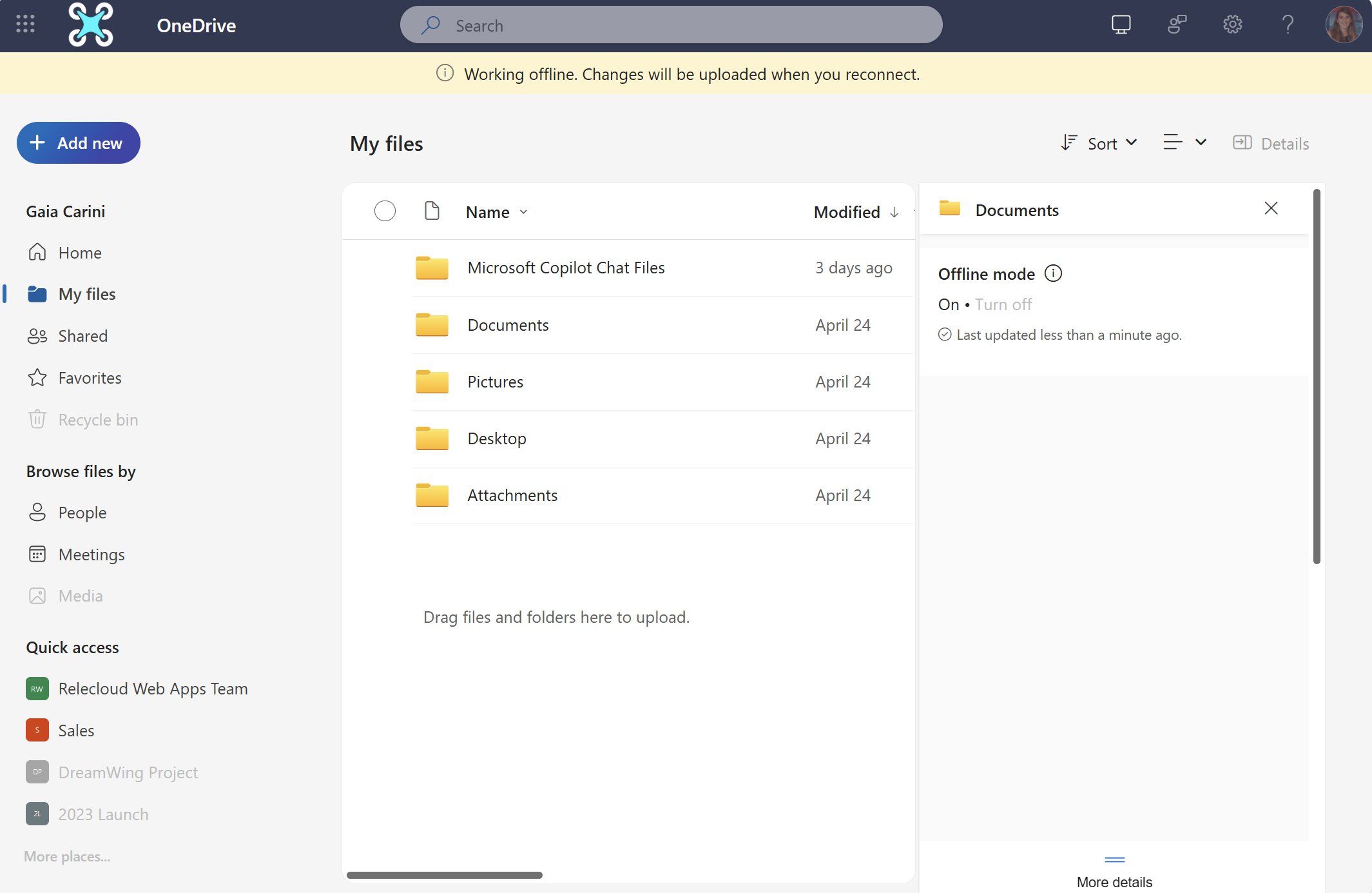 Modalità Web offline per collegamenti e raccolte : lavorare in viaggio, in aereo o ovunque sia necessario è diventato più semplice. Nell’app Web di OneDrive, ora puoi rendere “disponibili offline” le cartelle dei collegamenti e le raccolte documenti aggiunte. Modifica i file, rinomina le cartelle e mantieni alta la produttività, anche quando sei offline o la connessione è instabile.