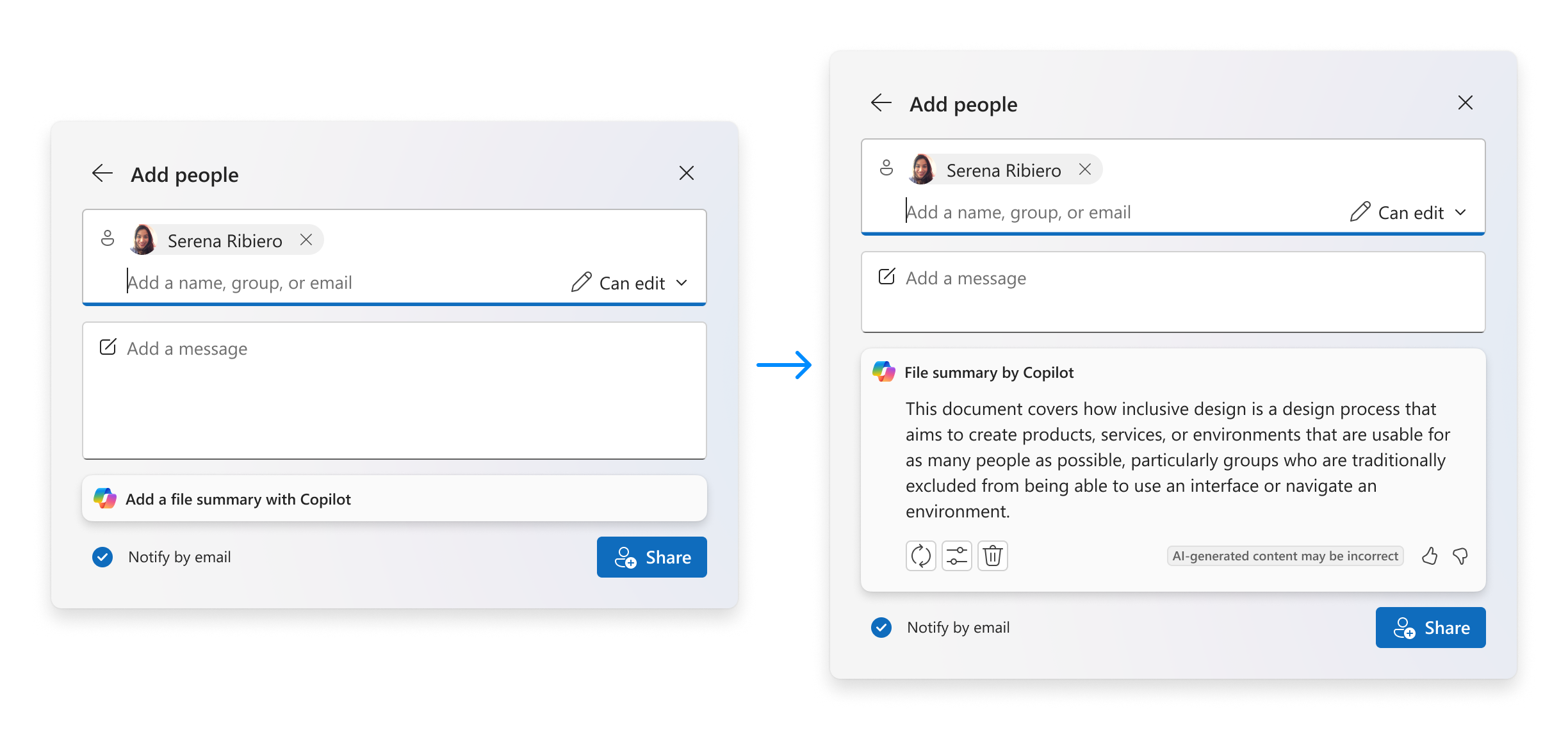 Perché non fornire al tuo team un breve riepilogo del file che stai condividendo per tenere tutti aggiornati? Ora, quando condividi un file, basta un solo tocco sul pulsante Copilot per ottenere immediatamente un pratico riepilogo da includere nella notifica di condivisione. I tuoi colleghi riceveranno i dettagli chiave in anticipo, senza bisogno di aprire il documento per capirne il contenuto.
