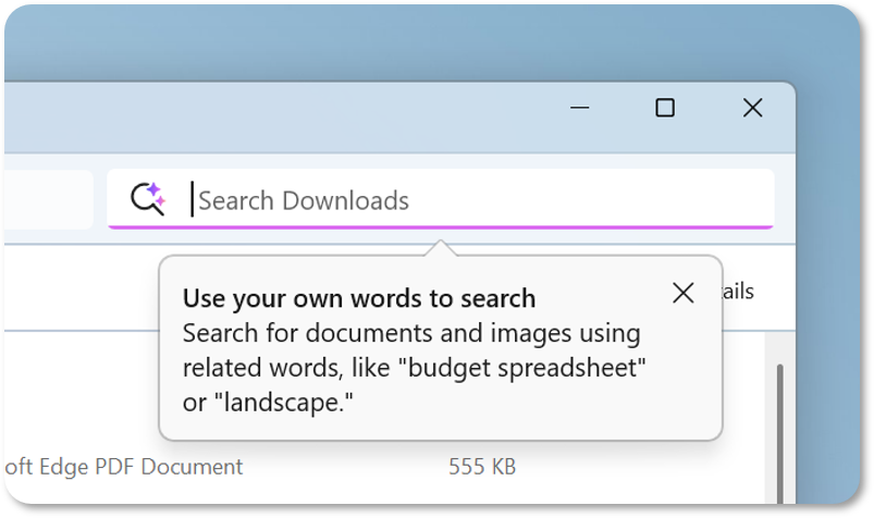 Ricerca intelligente sui PC Copilot+ – ogni volta che esegui una ricerca in Esplora file, il sistema analizza sia i file locali sia quelli nel cloud, offrendoti il ​​meglio di entrambi i mondi in una sola volta.