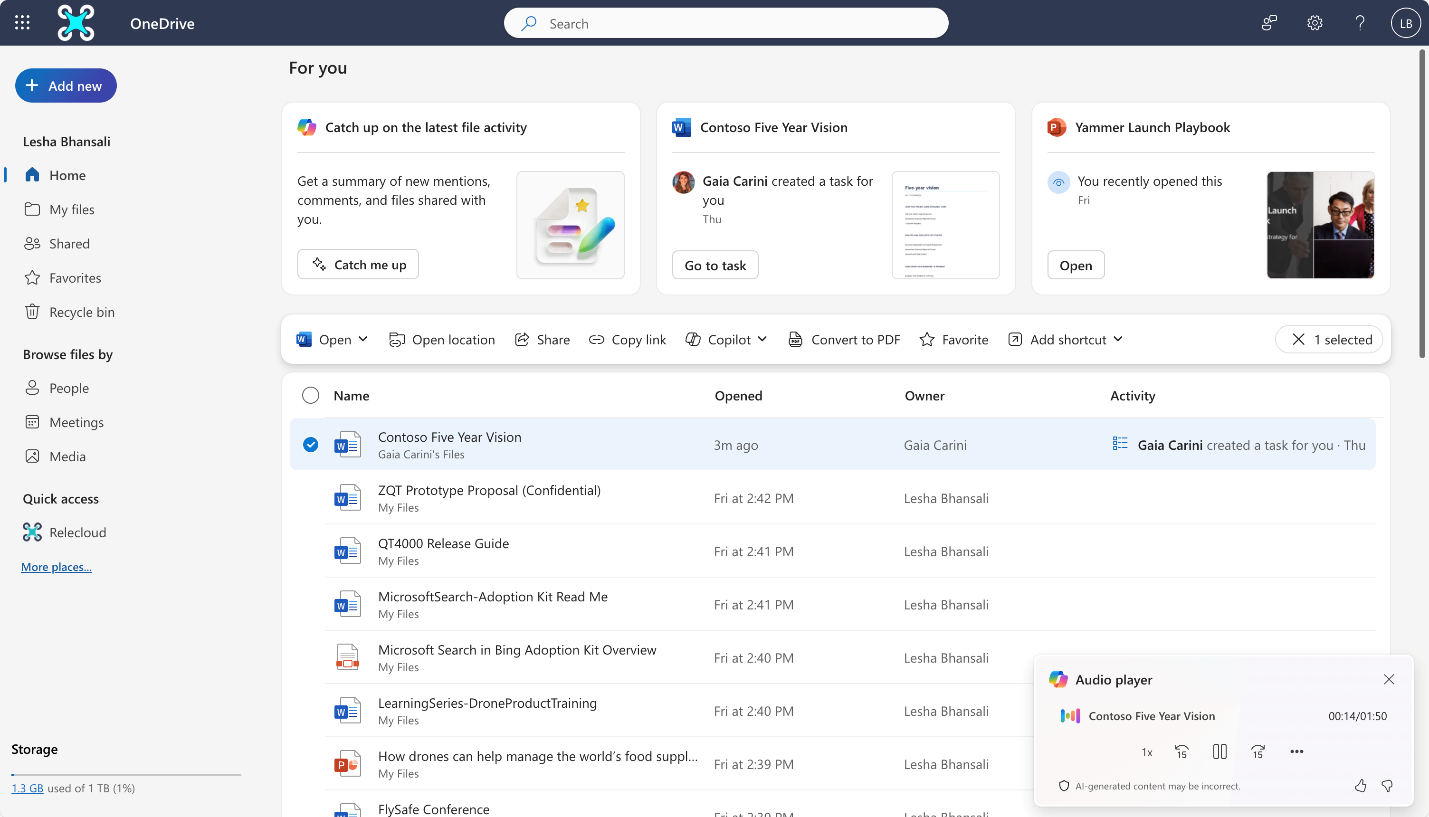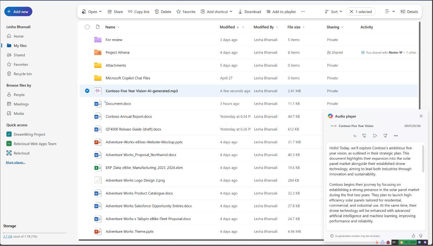 Iniziare a usare  le panoramiche audio è semplicissimo: basta un clic nel menu di OneDrive Copilot. Scegli un file qualsiasi, che si tratti di un documento Word , un PDF o persino la trascrizione di una riunione , e guarda Copilot trasformarlo in una panoramica audio coinvolgente in pochi secondi. Goditi la tua esperienza con approfondimenti a mani libere grazie a un player mobile e trascinabile che ti consente di controllare la riproduzione e di seguire i tuoi ritmi.