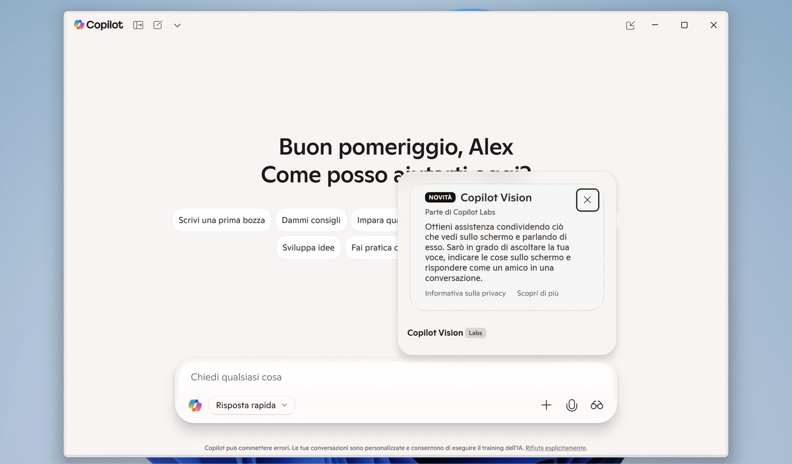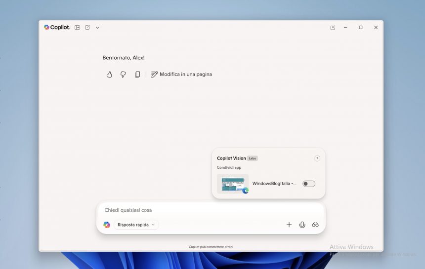 - Avviate l’app di Copilot e cliccate sull’icona degli occhiali per attivare Copilot Vision. Occorre avere almeno una finestra aperta oltre Copilot.