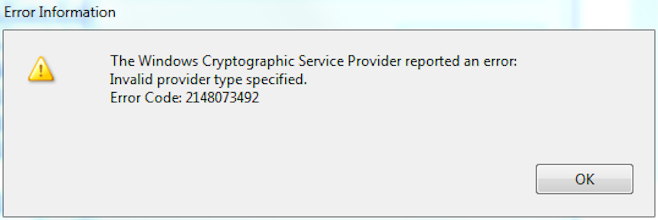 A causa di questo problema, gli utenti potrebbero visualizzare messaggi di errore quali “tipo di provider specificato non valido” ed “errore CryptAcquireCertificatePrivateKey”.