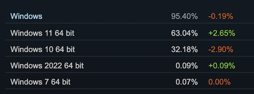 Discorso diverso in ambito gaming. Come riportano i dati di Steam nel mese di settembre Windows 10 è utilizzato da circa il 30 % dei suoi gamer. Sebbene rimanga una grossa fetta di mercato Windows 11 ha raggiunto oltre il 60 % degli utenti in questo ambito.