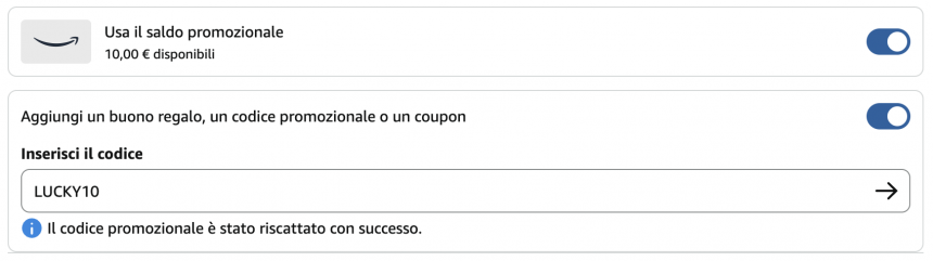 Inserite i prodotti di vostra scelta nel carrello, non è richiesto nessun importo minimo per ottenere lo sconto. Dopodiché inserite il codice promozionale LUCKY11 in fase di pagamento nel campo Aggiungi un buono regalo, un codice promozionale o un coupon come nell’immagine sottostante e completate l’acquisto.
