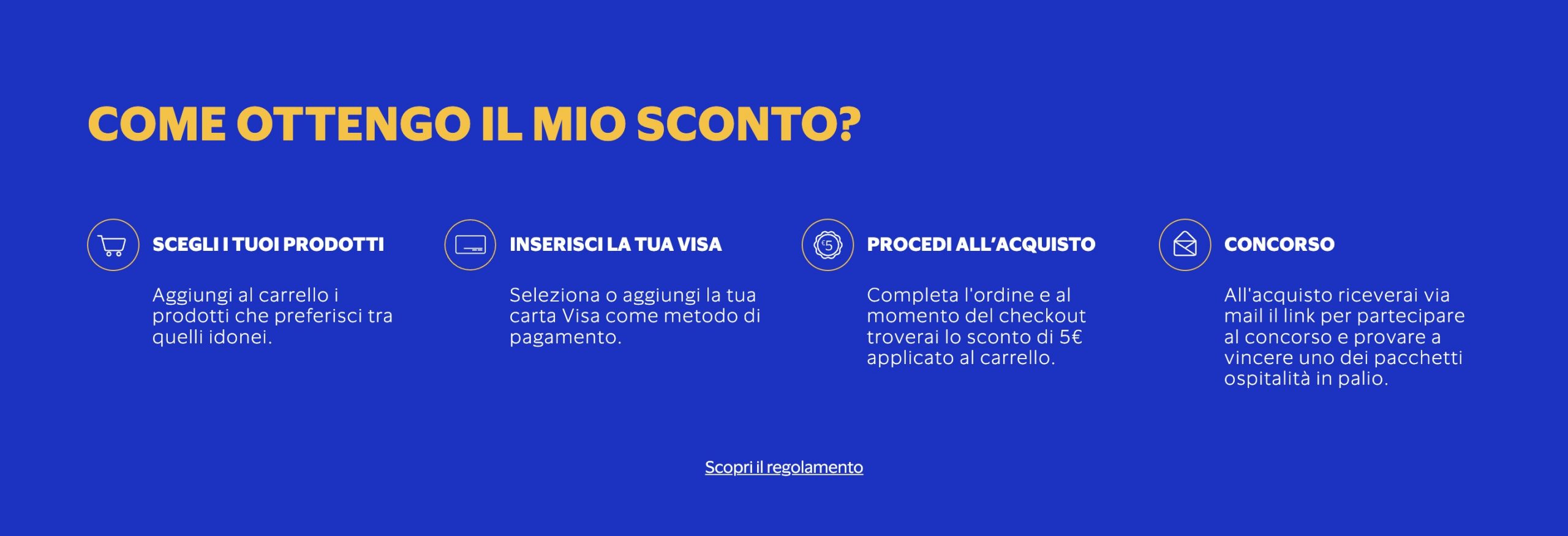 Per ottenere i 5 € di sconto basta recarsi a questo indirizzo e aggiungere al carrello i prodotti di vostra scelta e scegliere una carta Visa come metodo di pagamento. Lo sconto verrà applicato automaticamente al totale dei vostri acquisti.