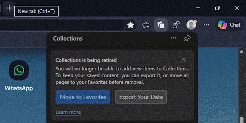 12 GENNAIO 2026 | A quasi sei anni dal lancio secondo un report sembrerebbe che Microsoft abbia deciso di dismettere la funzionalità Raccolte da Edge. Sulla versione Dev è comparsa una notifica avverte della fine del supporto e invita gli utenti a spostarle nei preferiti o ad esportarle. Al momento non è chiaro quando verranno ritirate definitivamente sulla versione stabile.