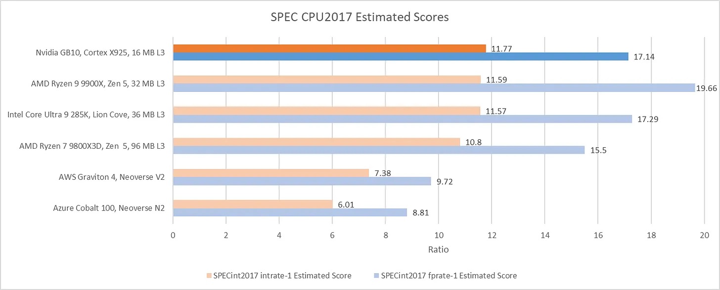 5 MARZO 2026 | Secondo nuovi benchmark della CPU Cortex X925 del nuovo SoC NVIDIA e MediaTek N1 sembrerebbe confermare prestazioni simili ai più recenti processori di AMD e Intel. Al momento si tratta di test teorici ma che evidenziano la bontà della CPU se consideriamo che i risultati sono ottenuti con una frequenza di clock di soli 4 GHz, molto inferiore rispetto ai processori rivali a 5 Ghz.