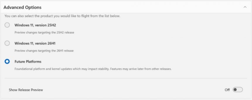 Inoltre, a differenza del sistema precedente sarà possibile scegliere anche la versione di Windows compatibile con il proprio hardware. Ad esempio un normale PC potrà optare per ricevere la versione 25H2 mentre un Copilot+ PC potrà scegliere la versione 26H1 oppure si potrà optare per non aderire a nessuna versione specifica aderendo alla versione futura denominata Future Platforms.